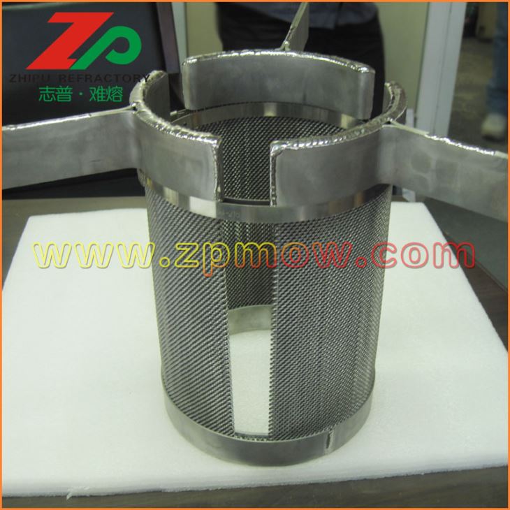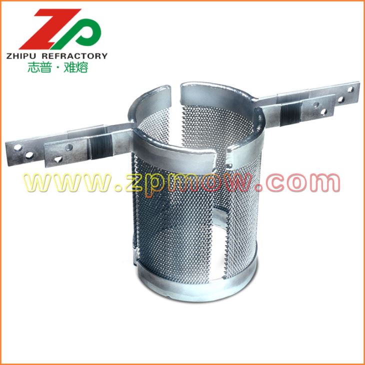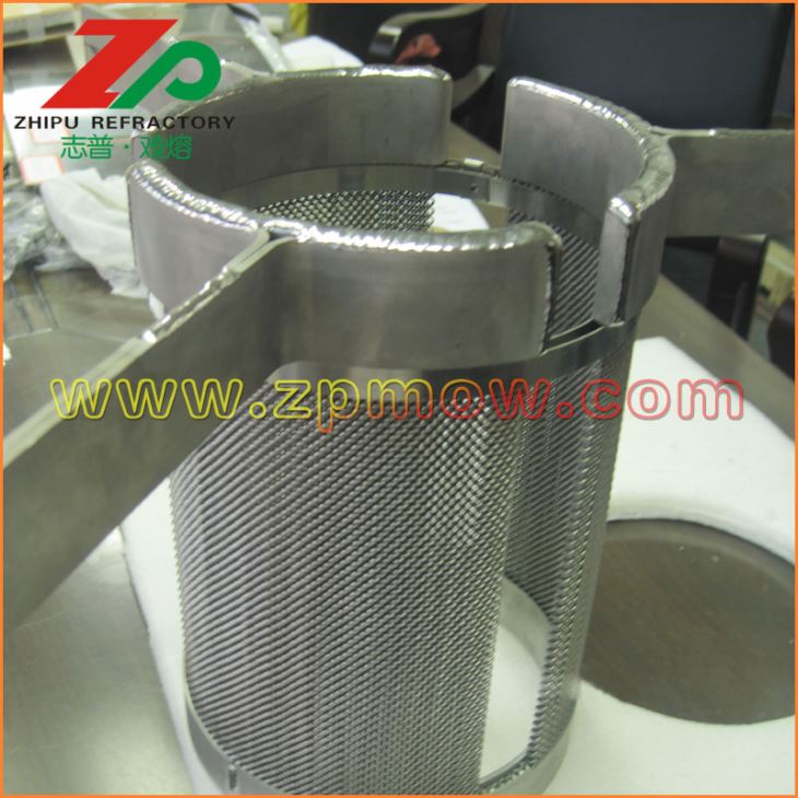 發(fā)熱體一般采用鳥籠結(jié)構(gòu)鎢發(fā)熱體或者鎢絲網(wǎng)發(fā)熱體,有利于提供均勻穩(wěn)定的溫場。 鎢絲網(wǎng)發(fā)熱體組件做為藍寶石晶體生長爐內(nèi)的熱源,對鎢坩堝內(nèi)的熔液形成湍流、產(chǎn)生徑向溫度梯度具有決定性的作用。因此,具有高純度、高密度、制作精良、設(shè)計合理的鎢絲網(wǎng)發(fā)熱體組件對藍寶石晶體的質(zhì)量控制,節(jié)約能源以及使用壽命具有重要意義。