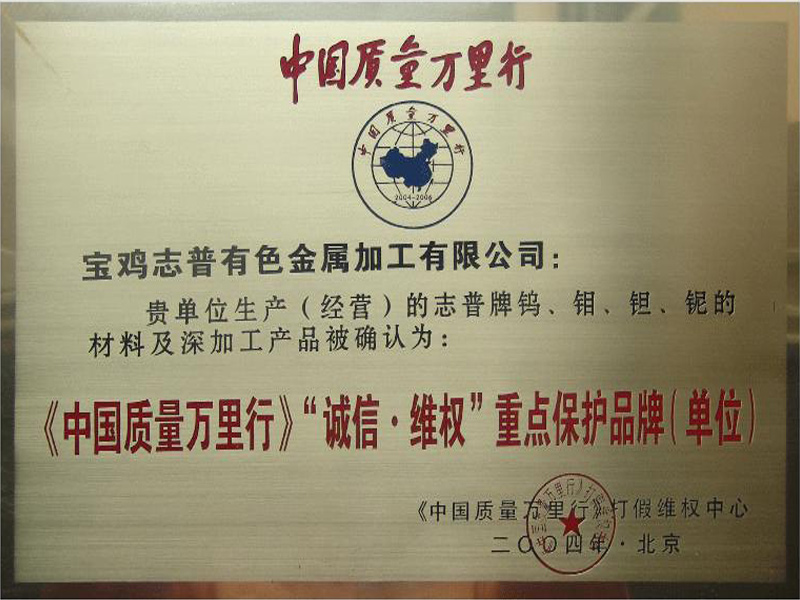 寶雞志普有色金屬加工有限公司生產(chǎn)(經(jīng)營)的志普牌鎢、鉬、鉭、鈮的材料及深加工產(chǎn)品被確認(rèn)為:《中國質(zhì)量萬里行》“誠信·維權(quán)”重點保護(hù)品牌(單位)