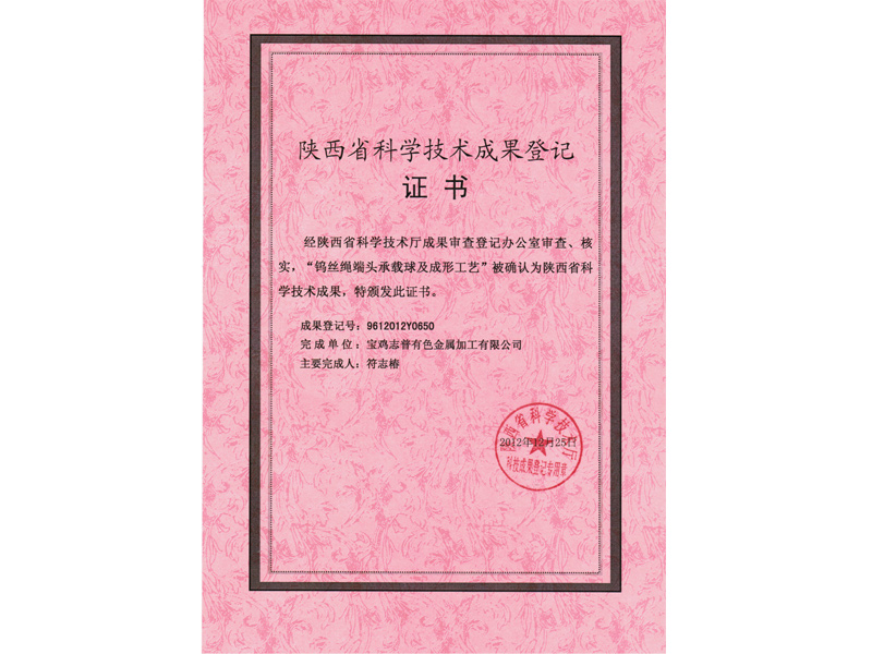寶雞志普有色金屬加工有限公司鎢絲繩產(chǎn)品經(jīng)陜西省科學(xué)技術(shù)廳成果審查登記辦公室審查、核實(shí),“鎢絲繩端頭承載球及成形工藝”被確認(rèn)為陜西省科學(xué)技術(shù)成果,特頒發(fā)證書,成果登記號(hào):9612012Y0650.