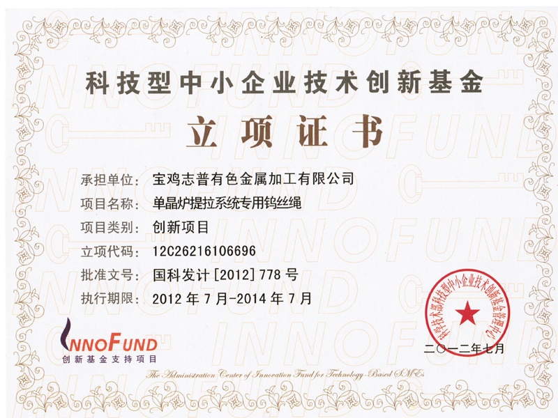 寶雞志普有色金屬加工有限公司單晶爐提拉系統(tǒng)專用鎢絲繩項目被確認為科技型中小企業(yè)技術創(chuàng)新基金立項為創(chuàng)新項目。